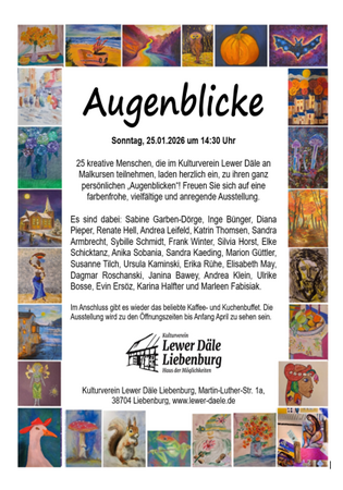 Alle Malerinnen und Maler, die in den Malkursen des Kulturvereins zusammenkommen, gewähren einen Blick auf ihre Werke. Es sind Augenblicke,die die 25 Maler gerne teilen, so farbenfroh, vielfältig und inspirierend!