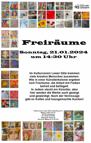Unter dem Titel "Kleine Auszeit" zeigen die Teilnehmer der Malkurse in der Lewer Däle ihre Werkschau. Schon während des Entstehungsprozesses der Werke nehmen wir uns eine Auszeit vom Alltag, und nun bei der Präsentation der gerahmten Bilder ein zweites Mal. Im Anschluss an die Vernissage verwöhnen wir die Besucher mit Kunst, Kaffee und Kuchen!