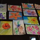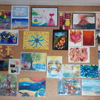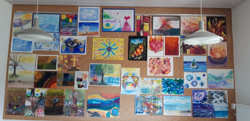 Beim Kirschblütenfest konnte man die Bilder der seit kurzem aktiven Malgruppe von Dr. Ulrike Bosse erstmals sehen: Die Kursteilnehmerinnen des Workshops "Malen, Musik und Meditation" stellten ihre Werke zu den 4 Elementen Feuer, Wasser, Erde und Luft aus. Man sieht den Gemälden die Begeisterung der Malerinnen bei ihrer Arbeit förmlich an, geballte Lebensfreude mit expressiven Farben!