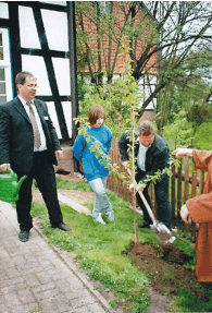 Am 18.4.09 fand unser erstes Kirschblütenfest statt, bei dem wir die Lewer Däle eingeweiht haben. Aus diesem Anlass pflanzte Ortsbürgermeister Dirk Sobania einen Kirschbaum, den das Gründungsmitglied Dirk Glufke (links im Bild), Pfarrer in der Evangelischen Kirchengemeinde St. Trinitatis, gestiftet hatte.